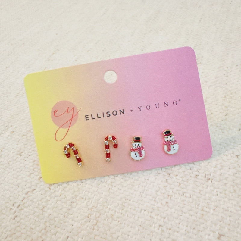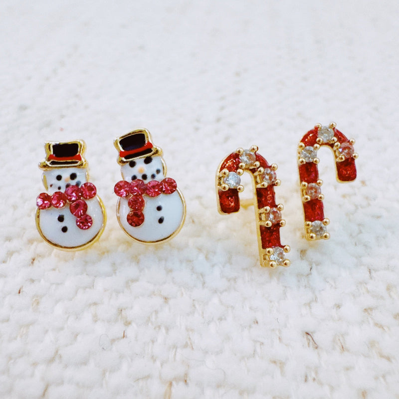 Candy Cane & Snowman Stud Earring Set Of 2 - Holiday Sparkle