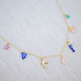 Make waves with this adorable charm necklace featuring sea-inspired icons like a dolphin, fish, starfish, shell, and more. With soft enamel details and a dainty gold-tone chain, it’s the perfect piece for beach lovers and summer fun.