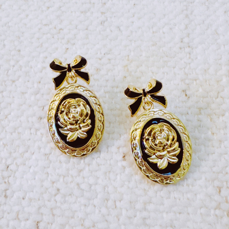 Black Bow Rose Drop Earrings – Elegant Black and Gold Antique-Inspired with Bow Accents