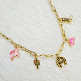 A bold twist on cowgirl chic, this charm necklace brings the wild west to life with enamel and gold-tone icons—featuring a rearing horse, cactus, cowboy hat, boot, and lucky horseshoe. The playful charm mix adds personality and fun to any outfit, from city strolls to country nights.